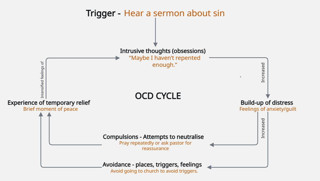What makes this cycle so distressing is that the very behaviours designed to soothe the anxiety — such as compulsive praying, confessing, seeking reassurance from spiritual leaders, researching to find the correct theological answers, or avoiding certain spiritual practices — actually make the anxiety worse in the long run. Each repetition confirms to the brain that these thoughts must be dangerous, that only ritual or control can make things right. Over time, this pattern becomes deeply entrenched, leading to increased feelings of guilt and self-doubt rather than peace or faithfulness [1,2].